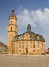 Die Walterhäuser Stadtkirche "Zur Gotteshilfe", Thüringens erster großer barocker Zentralkirchenbau, gilt in Grundrissausbildung und Bauausführung als Vorläufer der 1726 bis 1738 von Georg Bähr in Dresden errichteten Frauenkirche. (Dehio-Vereinigung e. V.)